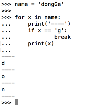 name = 'dongGe' for x in name: print('----') if x == 'g': break print(x)运行结果: