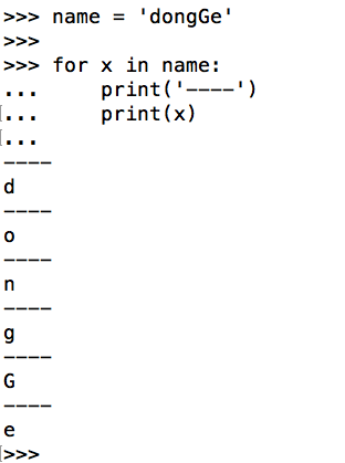 name = 'dongGe' for x in name: print('----') print(x)运行结果: