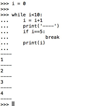i = 0 while i<10: i = i+1 print('----') if i==5: break print(i)运行结果: