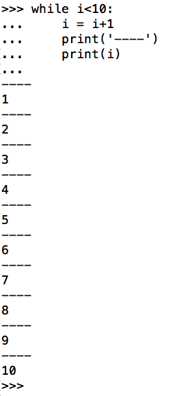 i = 0 while i<10: i = i+1 print('----') print(i)运行结果: