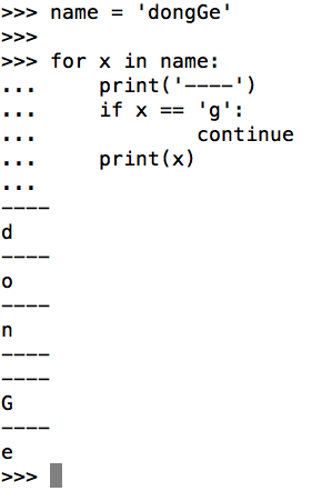 name = 'dongGe' for x in name: print('----') if x == 'g': continue print(x)运行结果: