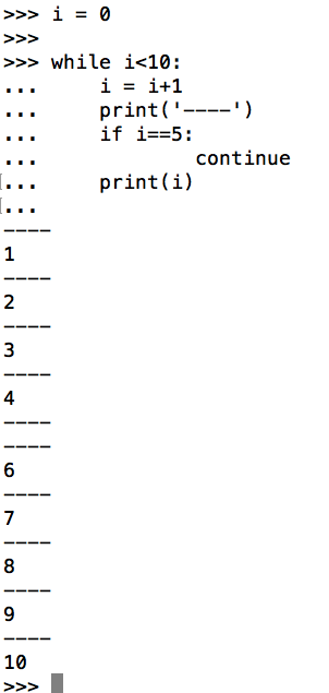 i = 0 while i<10: i = i+1 print('----') if i==5: continue print(i)运行结果: