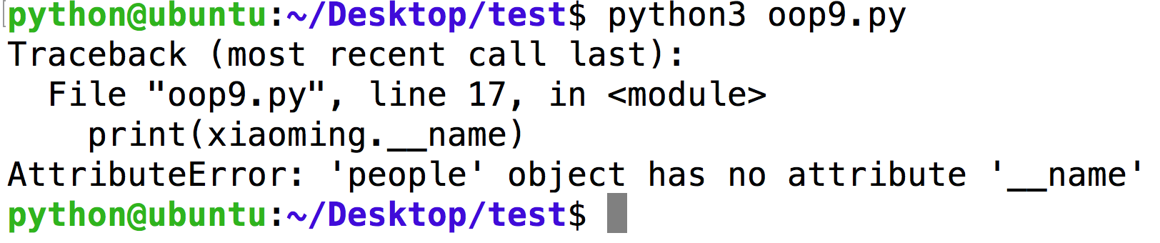 - 它是以属性命名方式来区分,如果在属性名前面加了2个下划线'__',则表明该属性是私有属性,否则为公有属性(方法也是一样,方法名前面加了2个下划线的话表示该方法是私有的,否则为公有的)。