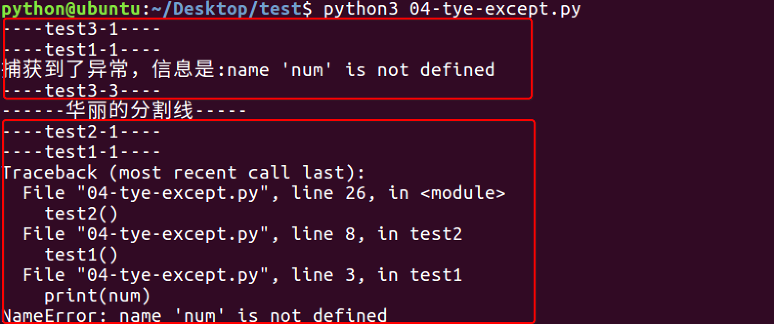 - 注意观察上图中,当调用test3函数时,在test1函数内部产生了异常,此异常被传递到test3函数中完成了异常处理,而当异常处理完后,并没有返回到函数test1中进行执行,而是在函数test3中继续执行